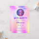 A girly and feminine Sweet 16 party invitation. A holographic coloured background in purple, pink, yellow, blue. Decorated with a colourful disco ball. Text: Let's Party! Personalise and add a name and party details. The name is written with a hand lettered style script, purple coloured letters.