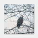 A photograph of a Bald Eagle sitting on a tree branch, looking to one side, with having a piece of fish dangling from it's beak. The bird appears to have a furrowed brow, indicating it has disgust for whomever disturbed it. The tree that the eagle is perched in has no leaves as the photographed scene was in winter. Image Copyright ©2021 Kimberly J Tilley.