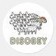 Disobey design features a flock of obedient sheep obeying the latest farming directive. One black sheep thinks for itself and chooses its own path. Fun graphic for those who don't feel like following orders.