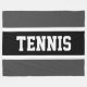 This fun sports design features classic strong bold big letters inside a highlighted wide black stripe with white pinstripes on a dark grey background with "TENNIS" spelled out front and centre. Make It Your Own: The colours and text in this design can be personalised.