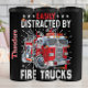This is a fun, graphic design for anyone obsessed with emergency vehicles. A stylised red fire truck is rendered in a cartoon style with many exciting details and is surrounded by a white burst effect. The text above the truck reads "EASILY DISTRACTED BY", and the bottom text finishes the message with "FIRE TRUCKS". The customisable name "Theodore" is placed vertically on the left, making this a great personalised gift for a fire engine enthusiast.