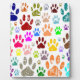 A pattern of dog paw prints in many colours and sizes.