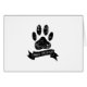 Distressed dog paw print with black ribbon. Man's best friend. Black and white image.