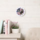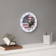 A majestic bald eagle has outstretched wings and bared claws on this patriotic clock. The eagle image is set against a portion of a distressed USA flag. Navy blue numbers around the white perimeter border make the clock easy to read.
