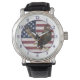A majestic bald eagle has outstretched wings and bared claws on this patriotic watch. The eagle image is set against a portion of a distressed USA flag. Navy blue numbers around the white perimeter border make the watch easy to read.