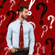 This cool necktie features distressed question marks of varying sizes and fonts in black and white on maroon.