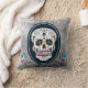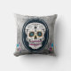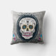 Distressed Sugar Skull in a Frame Pillow. A great sugar skull illustration by artist Julie Farrell. Beautifully coloured and detailed with flowers and flourishes this skull literally pops off the pillow. background is a distressed grey and is embellished with fancy flourishes.