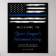 This retirement party welcome sign features a distressed police thin blue line flag, black background and fully editable wording. Easily use to celebrate your favourite officer's retirement, a new police academy graduation, or any other police related event.