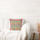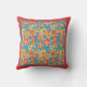 A Throw Pillow or Cushion with an all-over pattern of red, orange and yellow flowers on a bright turquoise background, from a handpainted paper collage by Judy Adamson.