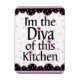 A cute magnet for the baker in your home. It has a pink and white swirl background with pink and black to and bottom. It says I'm the Diva of this Kitchen. Very cute.