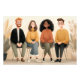 Four diverse young adults sit side by side in relaxed poses, sharing smiles and quiet connection. A bearded man in glasses, a woman with long brown hair, a woman with radiant curly hair and gold hoops, and a man with curly dark hair create an inclusive, joyful group portrait set against a soft beige backdrop with gentle leafy accents. The warm color palette and cozy style radiate friendship, belonging, comfort, diversity, and everyday happiness—perfect for living rooms, bedrooms, therapy offices, community spaces, dorms, home offices, or as uplifting gifts for friends, mental-health advocates, teachers, parents, or anyone who values representation, warmth, and human connection.