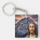 A solemn statue of Jesus with outstretched arms, inscribed with the words The Lord is My Rock from Psalm 18;2, symbolising faith and strength.