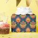 This radiant pattern features stylised lotus blooms in shades of red, orange, and yellow, each centred with a glowing circular core that evokes the light of a diya. Set against a deep navy background, the symmetrical floral bursts are interwoven with dots, circles, and delicate flourishes, creating a rhythmic tapestry of celebration. The design pulses with warmth and tradition, making it perfect for textiles, gift wrap, or festive décor.