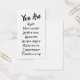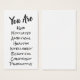 This set of gorgeous cards can be customised to feature the words you prefer. The original design reads "You Are Kind Motivated Ambitious Healthy Intelligent Beautiful Confident Productive" with each affirming word on a new line. Use the template fields to replace any of the affirmations with one or more of your own, replace them all, or buy them as is. You may wish to change "You Are" to "I Am" or "We Are" or "Let's Be" or all manner of other declarations! Suitable for people intending to remind others of their worth, for positive thinkers, for those who practice the Law of Attraction, or for anyone at all who enjoys participating in the "Random Acts of Kindness" movement. The possibilities go on and you can enjoy them in whatever way you prefer. The design is simple and basic with black text over a plain white background that is editable; add whatever colour you prefer or even add a graphic or photo behind the words; make this card your own! Many other similar designs are available so check out the other similar designs in my store, too, if you'd like something less plain than these are.