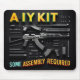 A visually striking high-resolution image showcasing a disassembled AK-47 against a sleek black background. The gun components are meticulously arranged, emphasizing their intricate details. The bold yet humourous text, "DIY Kit: Some Assembly Required," adds a playful touch to the technical aesthetic, making the image both engaging and entertaining. Perfect for enthusiasts who appreciate the intersection of precision engineering and humour!