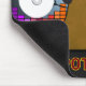 Funny cute mouse pad featuring a happy brown cartoon DJ potato wearing headphones and holding a record in his stick arms. He has two tiny dots for eyes and a big happy smile. In front of him is a DJ desk with a template reading DJ POTATO in a dark maroon with a yellow outline. This can be used as it is or replace with your own text to personalise. Behind the potato is a colourful equalizer and some musical notes.