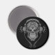 An elaborate DJ sugar skull design decorated with intricate swirls and dot patterns. Headphones sit on top of the skull with two wires hanging below. The complex lines and circles are solid black while the interior of the skull is finished with highlighted shades of gray. Music blasts out of the headphones in the form of gray lightning bolts and the pure black background. This aggressive Day of the Dead inspired image makes a striking magnet