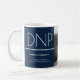 A keepsake mug that celebrates a DNP graduate. This minimalist design is blue and white with a photo in between the text areas. The photo is a template that is meant to be swapped out for your own. All the words and both colours can be customised.