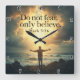 This powerful wall clock features a figure with outstretched arms standing at the edge of a turbulent sea, facing a sky where brilliant light breaks through dramatic clouds. The commanding scripture, "Do not fear, only believe – Mark 36," is prominently displayed. With its textured, dynamic artistry and clear numerals, this timepiece serves as a constant, inspiring reminder to embrace courage and unwavering faith in the face of life's uncertainties, trusting in divine power.