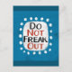 "Do Not Freak Out" is a cute text design in blue with black and red text, along with a white accent shape and white textured whimsical dots surrounding it.