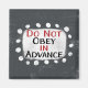 Bold text reading "Do Not Obey In Advance" is centred against a grey background. The black and red text sits on a white rectangle with large textured white dots around it, providing a playful contrast against the solid colour backdrop. This is Lesson #1 from "On Tyranny" by Timothy Snyder.