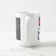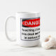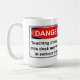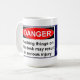 DANGER! Touching Things on This Desk May Result in Serious Injury! Funny office mug with a warning sign on one side and on the other an image of a body outline in chalk touching the outline of a stapler in chalk. The background gradients from dark blue to black to appear like a sidewalk with a crime scene...