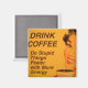 Smiling woman with retro red lipstick and nails drinks her cup of morning coffee. The caption reads "Drink Coffee - Do Stupid Things Faster with More Energy."