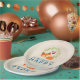 Paper plates with a cartoon drawing of a cute orange fox sleeping peacefully with little red hearts. A green foliage wreath behind. Text says: "Do what makes you happy". A rustic cream coloured background with a trendy pattern of faint geometric shapes.