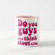 A thought-provoking and introspective design featuring the phrase 'Do you guys ever think about dying' in bold typography. This captivating visual creates a dark and emotional atmosphere, inviting reflection on life and death. With a mix of abstract shapes and subtle textures, this unique design is perfect for those seeking to express deep thoughts on a mug.