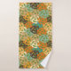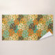 This towel set has an orange washcloth, a brown hand towel, and a bath towel with a mid-century modern design of a record adapter overlapping all over in tan, off-white, brown, orange, turquoise, blue, and green.