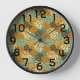 This clock has a mid-century modern design of a record adapter overlapping all over in tan, off-white, brown, orange, turquoise, blue, and green.