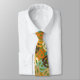 This necktie has a mid-century modern design of a record adapter overlapping all over in tan, off-white, brown, orange, turquoise, blue, and green.
