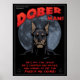 Poster/cover art for the newes costumed crime-fighter, Dober Man. The menacing avenger darkly rendered against a full moon, with titles. Posters, t-shirts, cards, gifts.