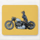 A Doberman Pinscher sitting on a bobber motorcycle. T-shirts, sweats, novelty gift swag.