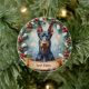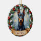 A beautiful, ultra-detailed Christmas ornament design featuring a realistic portrait of the breed centered within a soft, festive winter frame. This elegant design includes pine branches, red berries, and snowflakes against a snowy backdrop, illuminated by warm holiday lighting. The balanced, round composition includes clear space below the dog for customization.