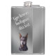The flask itself is fine. It’s a cheap flask, obviously bought in bulk, however am prepared to overlook that. Given that it is a personalized item, I would have liked to have seen gift boxing instead of the generic packaging. Terrible printing, and/or quality. It’s a cheap, tacky vinyl. It is not cut straight and is also applied in a way that it is overhanging the bottom, causing the glue to catch on items and it will eventually roll and tear, damaging the wrap.