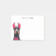 Doberman Pinscher black and brown coloured breed type dog wearing bright pink devil horns on a pink headband and a pink bowtie. Set on solid white. Use the templates to personalise with your name or message in black sans font.