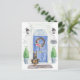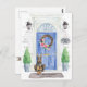 Announce your new address with our stylish announcement featuring a Doberman, blue front door, welcome mat, slate sign, topiaries and a floral wreath set on a grey brick background.