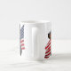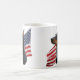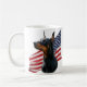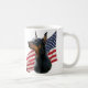 A proud black Doberman Pinscher headstudy in front of a waving American flag decorates this mug.