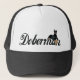 A Doberman Pinscher resting on top of the retro font text "Doberman" - A unique design for Doberman Pinscher owners and all lovers of this dog breed!
