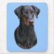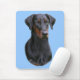 A black Dobermann Pinscher with natural ears (uncropped) on a mousepad. Choose a different background colour by clicking Customise>edit>background.