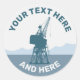 Silhouette of dockyard cargo crane. Vector icon with customisable colour. Two text fields on circle.