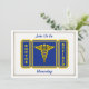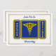 This blue and gold invitation is decorated on the front with a gold caduceus shiled. You can customise this card by placing your information into the boxes provided.