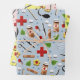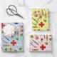 Creative medical-themed gift wrap pattern featuring healthcare supplies for your favourite doctor, nurse or physician assistant.