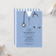 Creative medical school graduation party invites featuring blue hospital scrubs and stethoscope. Edit text to create unique doctor party invitation or medical school grad announcement.