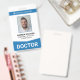 A modern ID badge for hospitals, clinics and medical facilities. The medical staff ID badge template includes an ID photo of your employee, the employees name and profession, as well as a badge ID number. The group name set as "doctor" is prominently displayed at the bottom with an arrow like design pointing it out. The back of the hospital staff ID badge is intentionally left blank and open for you to add further information about the employee and your hospital or clinic...