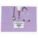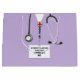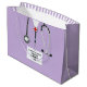 Creative medical school graduation doctor gift bag featuring lavender hospital scrubs and stethoscope. Edit text to add doctor, physician assistant or nurse's name and medical credentials.
