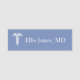 Ceil blue simple tag with white caduceus medical symbol and doctor's name in white print font