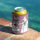 Gift for a doctor. Can cooler for a doctor or surgeon. Medical gift for a doctor. A light-hearted, funny cartoon, showing a doctor with stethoscope checking a patient's feet. Colour is black and white on a purple background. Funny doctor on a can cooler for a doctor or medical professional. Medical humour.
