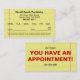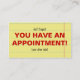 An easy to fill out appointment reminder card for your doctor’s or dentist’s office. Circle the day of the week and then fill in the date and time and circle AM or PM. Small text, “This time is reserved exclusively for you. If unable to keep this appointment please give 24 hours notice, otherwise you will be billed personally for the time reserved.” Huge red text on the back, “YOU HAVE AN APPOINTMENT!” All text can be changed and personalised for your business.